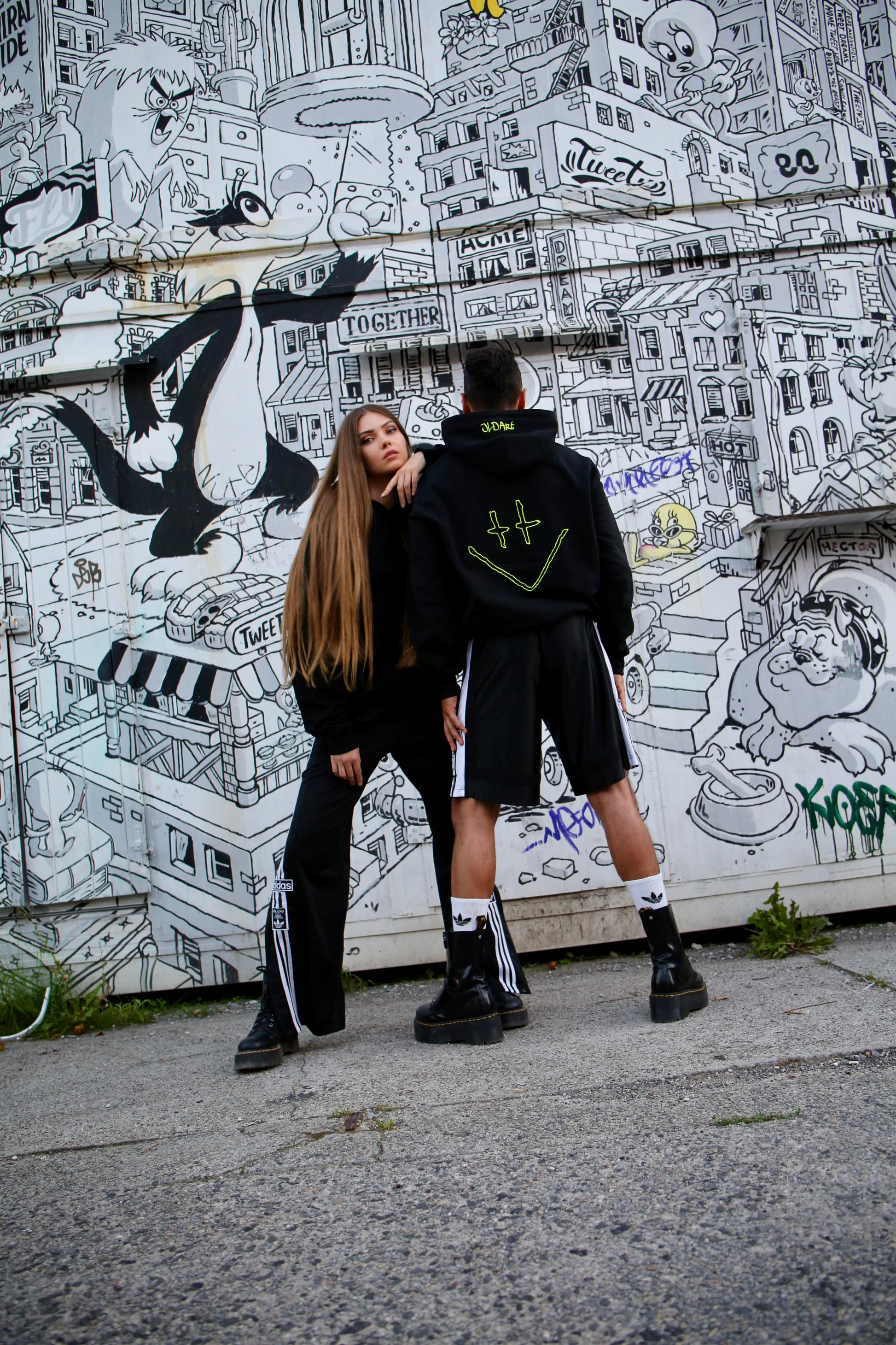 Der Bumble Hoodie– tiefschwarze Baumwolle trifft auf leuchtend-neongelben Smiley.
